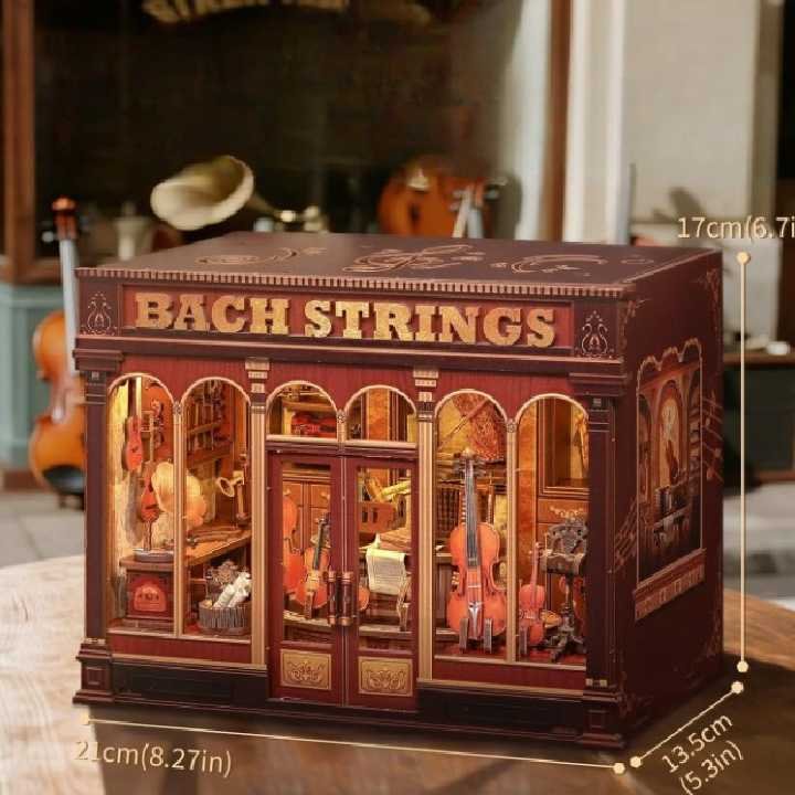 Mesurant 21 cm de long, 13,5 cm de large et 17 cm de hauteur, la Maquette boutique instruments à musique se glisse sur une étagère comme une petite vitrine secrète qui n’attend que votre regard.