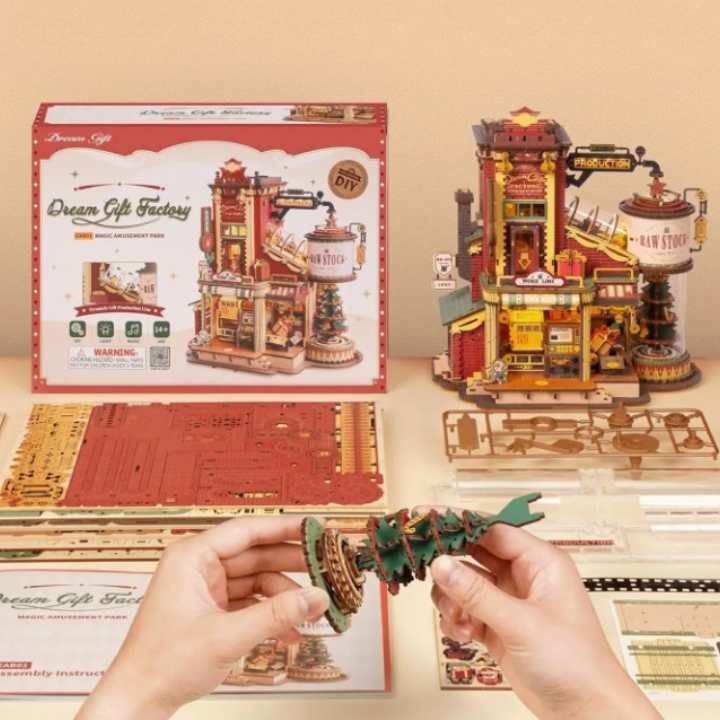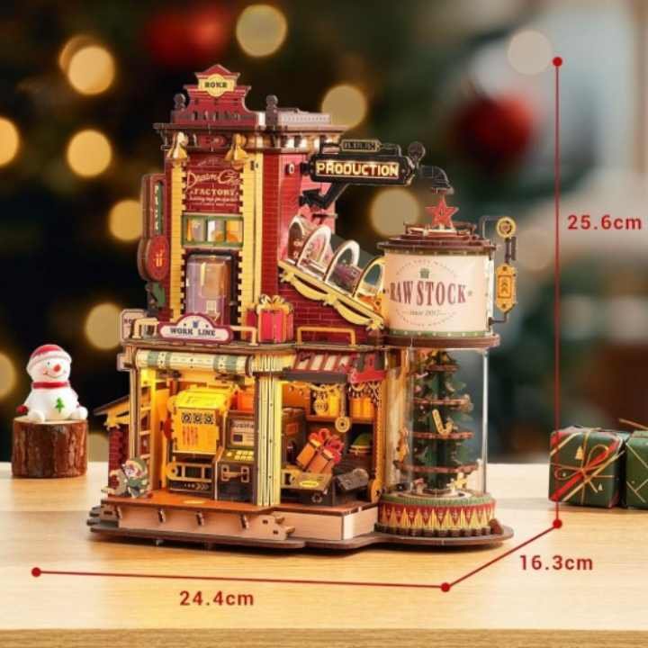 Les cadeaux répartis dans toute la fabrique donnent au décor une sensation d’abondance tranquille, jamais vide, jamais saturée. La structure verticale complète renforce l’impression d’une usine miniature construite avec patience et logique.