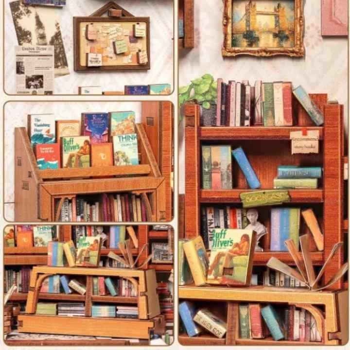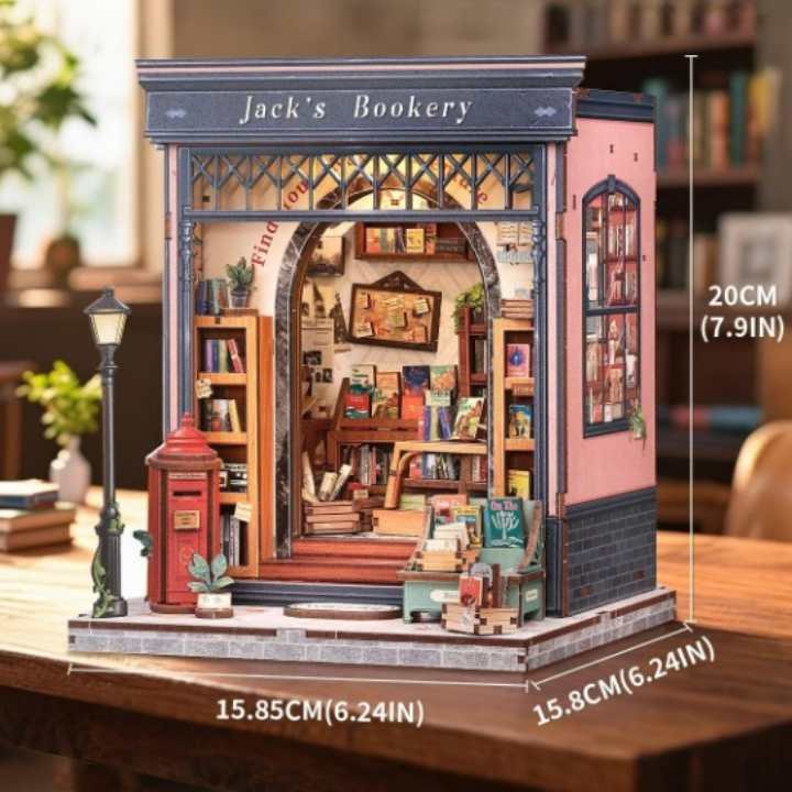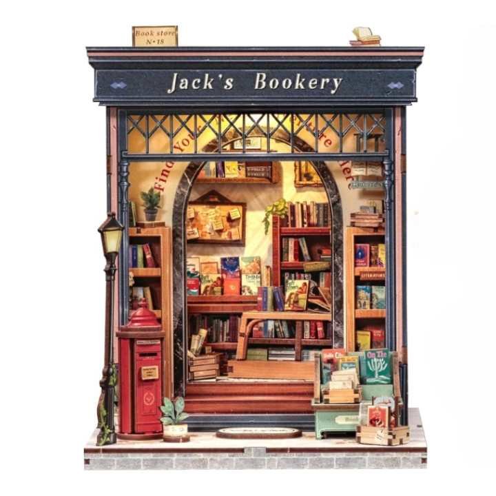 Un interrupteur latéral éclaire l’intérieur dès que vous l’activez. La lumière révèle les piles de livres, la caisse usée, les affiches collées de travers et les petites notes que Jack écrivait sur un coin de papier. Dans une pièce sombre, la scène devient un petit décor vivant, comme une librairie restée ouverte tard le soir.