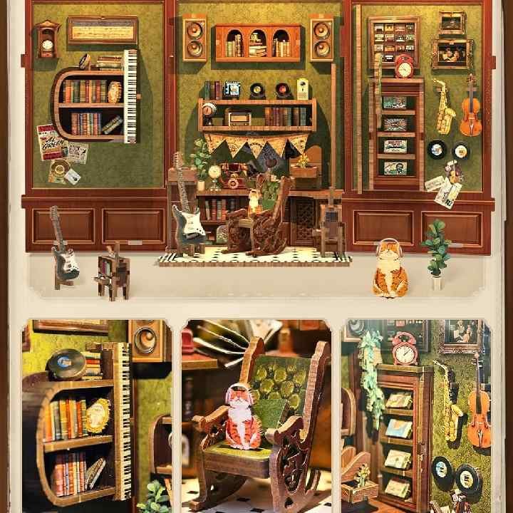 L’intérieur regorge de petits éléments imprimés et assemblés : étagères de livres, disques vinyles, partitions, instruments et objets décoratifs.