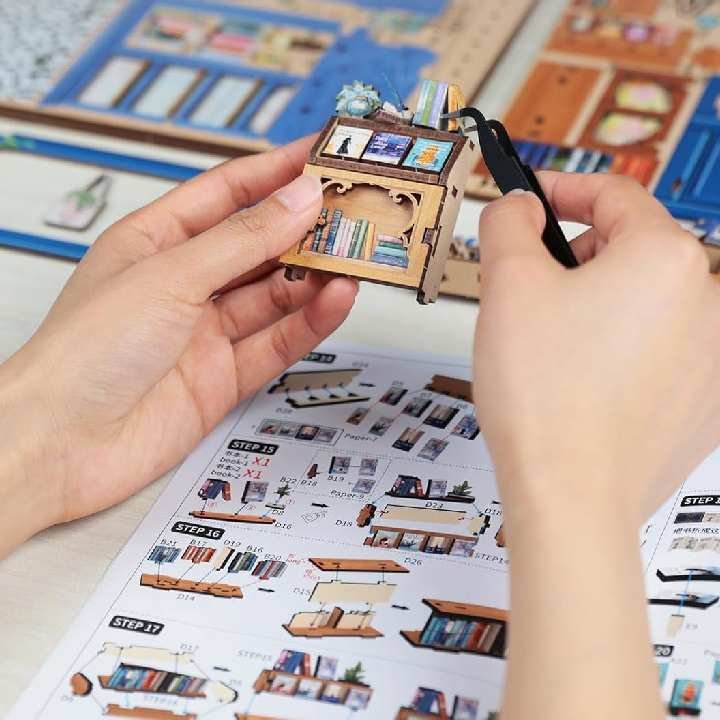La Maquette petite librairie contient 186 pièces à assembler à la main, offrant un montage progressif et satisfaisant.