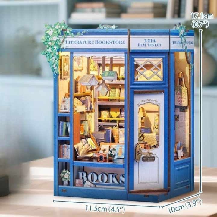 La Maquette petite librairie mesure 11,5 cm de long, 10 cm de large et 17,1 cm de haut, un format qui permet d’installer une vraie scène de boutique sur une étagère sans envahir l’espace.
