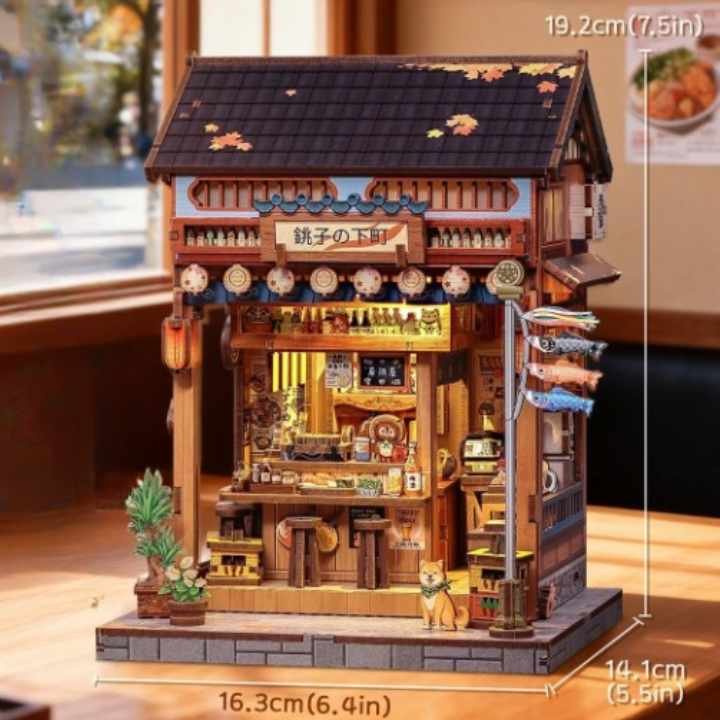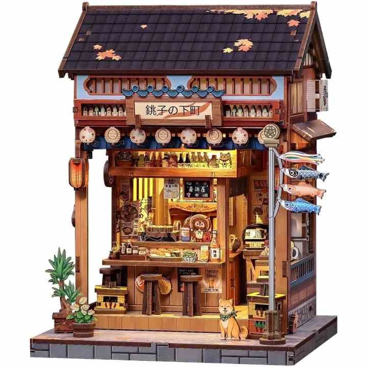 218 pièces à assembler transforment un simple tas de planches en une petite taverne japonaise pleine de bouteilles, de lanternes et de plats miniatures qui donnent envie de commander un bol de ramen à 3 cm de hauteur.