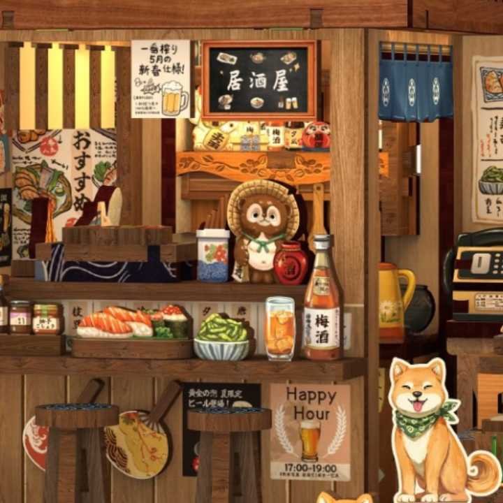 La façade de la maquette pub japonais remplie de lanternes attire l’œil, le comptoir donne envie de s’asseoir, et même le chien devant la porte a l’air de garder l’entrée comme si vous alliez lui donner des croquettes miniatures.