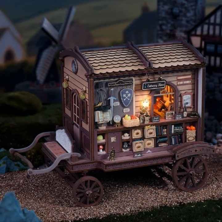 Une maquette roulotte du sorcier miniature façonnée en bois se présente comme une demeure errante, prête à reprendre la route dès les premières lueurs de l’aube.