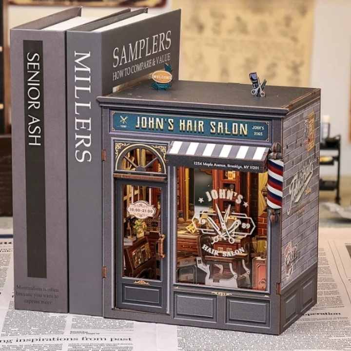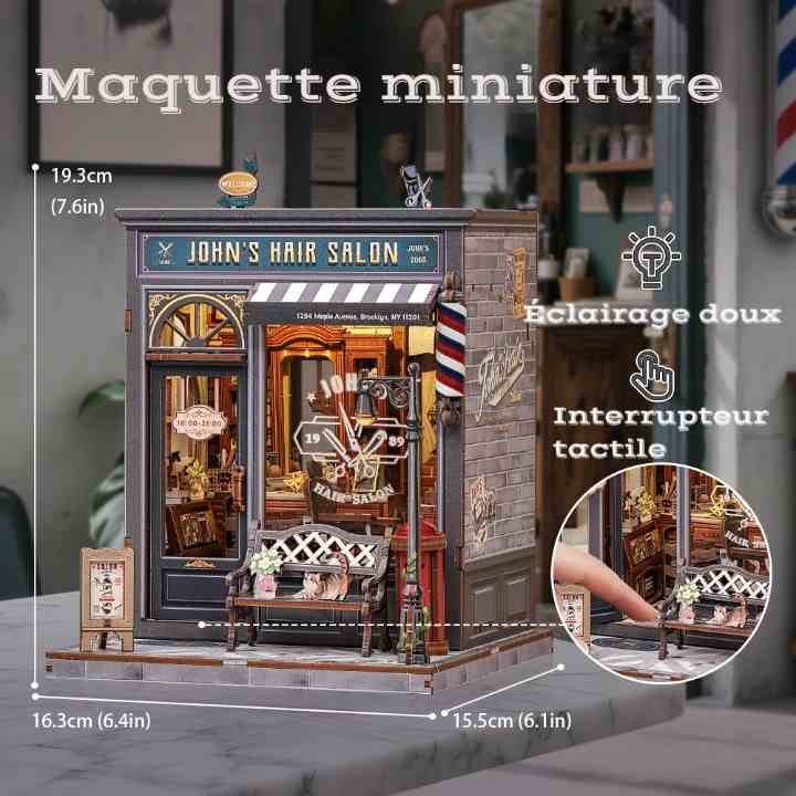 Maquette salon coiffure vintage compte 210 pièces à assembler, parfaites pour créer un petit salon de coiffure rempli de détails.