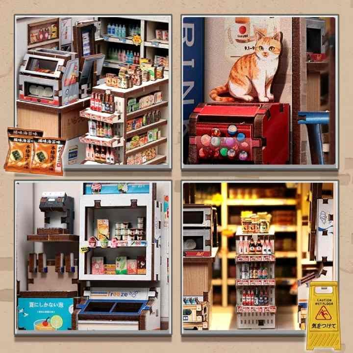 Les planches en bois imprimé intérieur et extérieur sont incluses, avec les murs, le toit, les enseignes et les machines miniatures prêtes à assembler. Les étagères se construisent pièce par pièce, puis se remplissent avec les produits fournis sur papier.